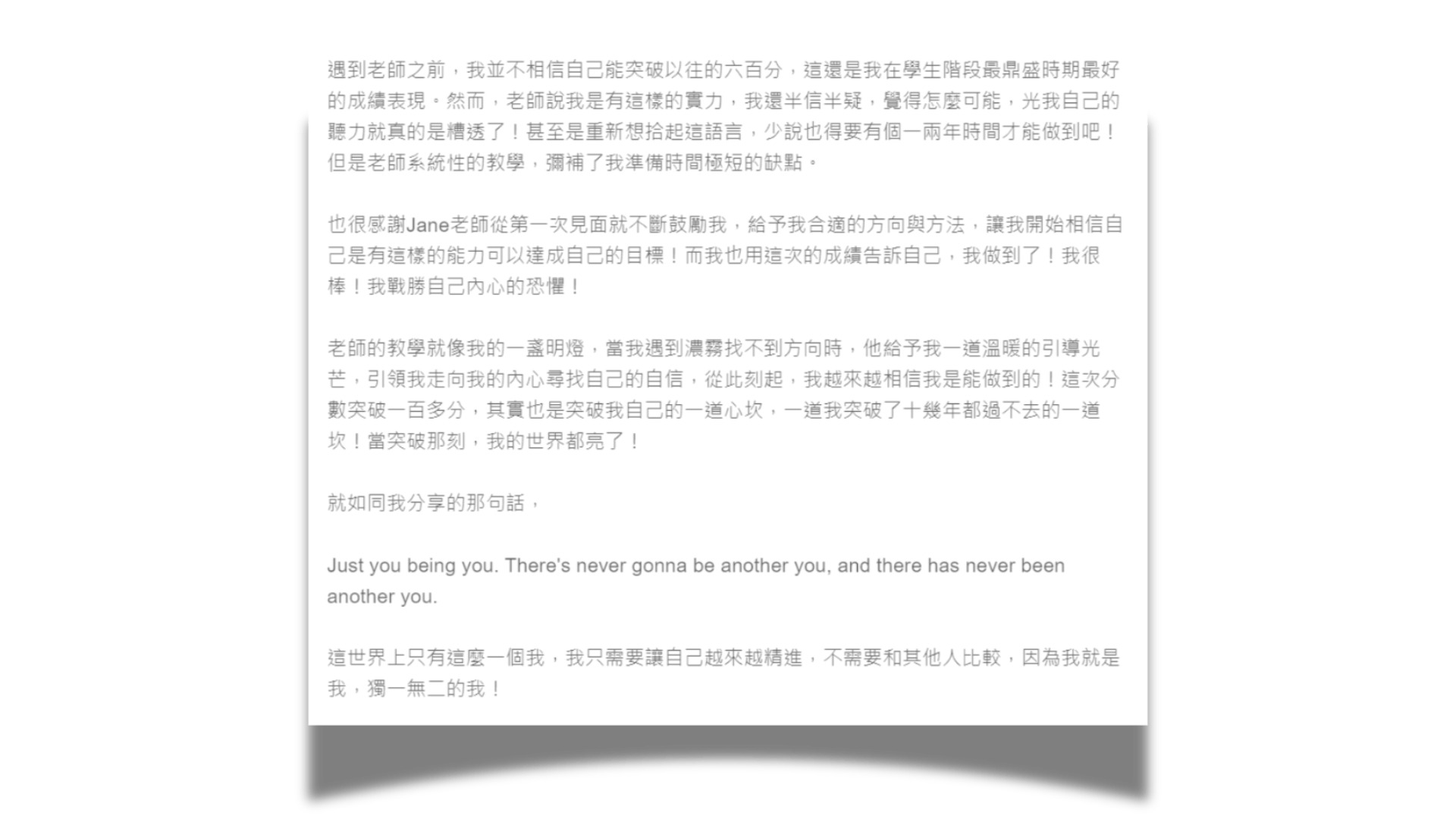最近收到幾位學員的回饋,我真的非常感動也替他們驕傲。這些學生來自不同的背景,有些是大學生,有些是忙碌的上班族,也有些是曾經對自己失去信心的語言學習者。他們有一個共同點:他們願意相信自己能做到。