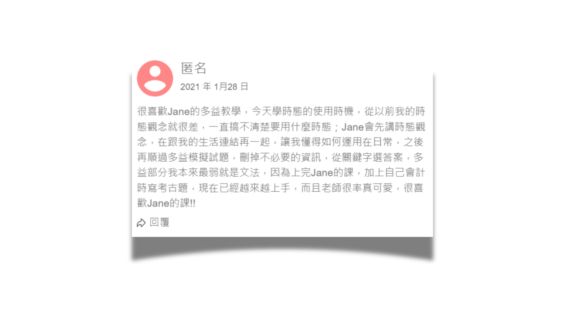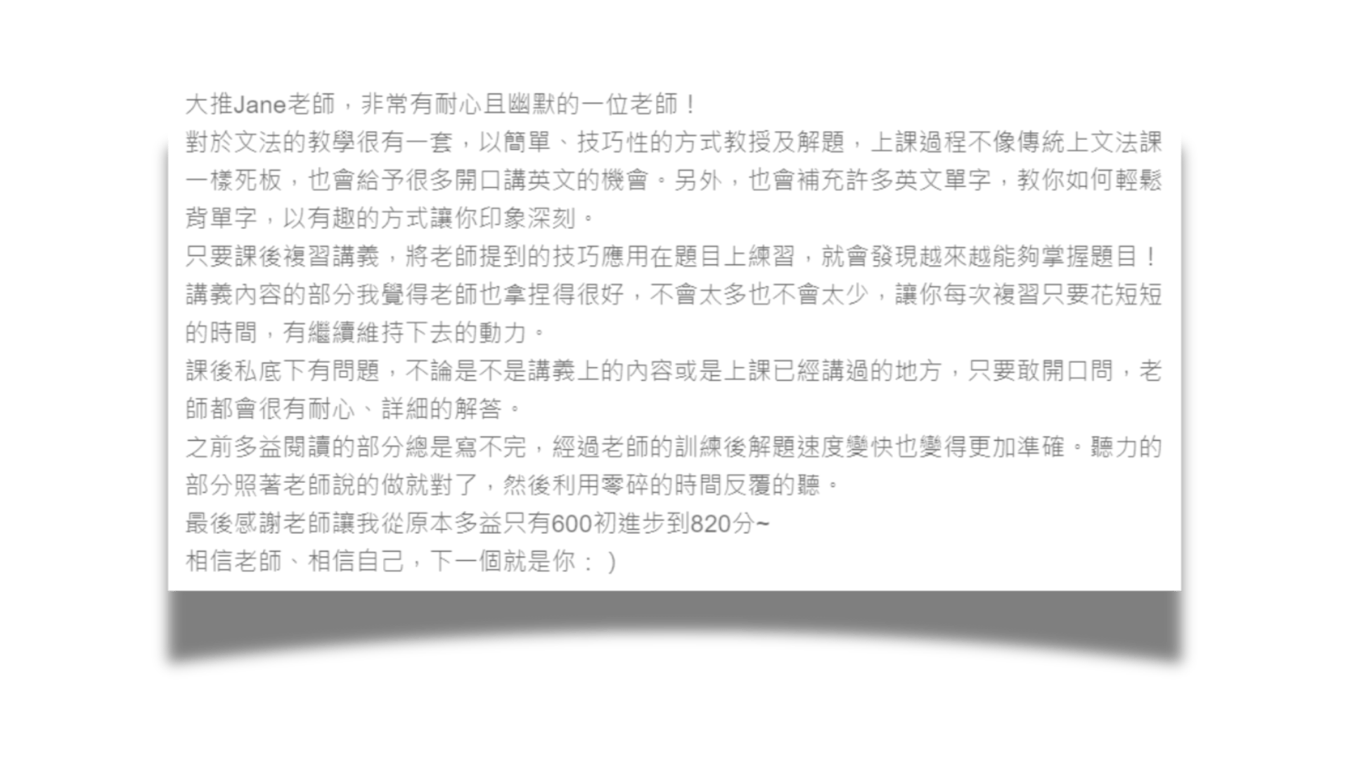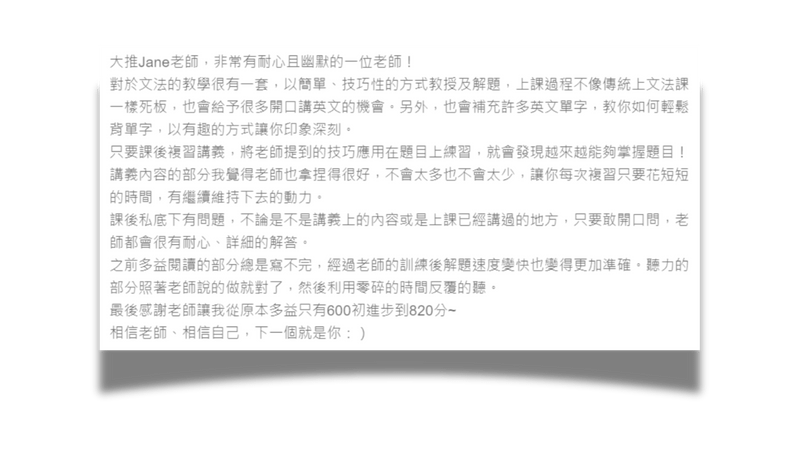 「從以前時態觀念就很差,根本搞不清楚要用什麼時態。」這是我一位學員在第一堂課告訴我的狀態,但幾週之後,她已經可以在日常生活中輕鬆運用時態,甚至在多益模擬試題中快速抓到關鍵字,準確選出答案。她說:「Jane 會先講時態觀念,再和我的生活連結,最後帶我刪掉不必要的資訊,直接瞄準得分。」